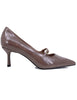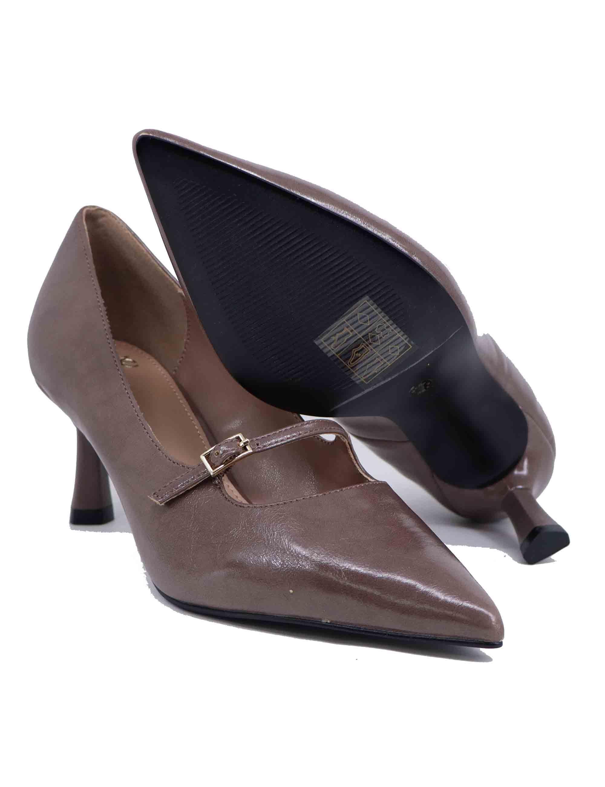Vegan women's pumps by Exe made of taupe eco leather with a high heel. Refinement and style come together in these eco leather pumps, featuring an elegant strap on the instep and a pointed toe. The tone-on-tone high heel further enhances the silhouette, making them ideal for evening events or formal meetings. The non-slip rubber sole ensures stability and comfort, perfect for long days or nights out. Shop now on Spatarella.eu to add an elegant and sophisticated touch to your outfit.