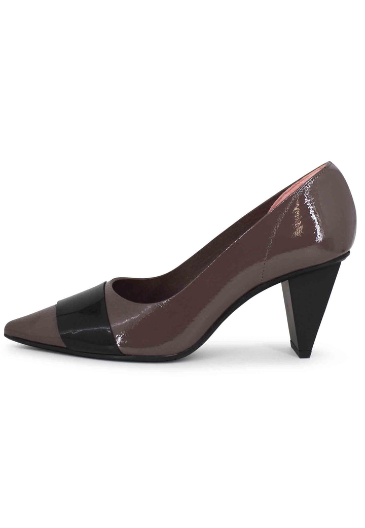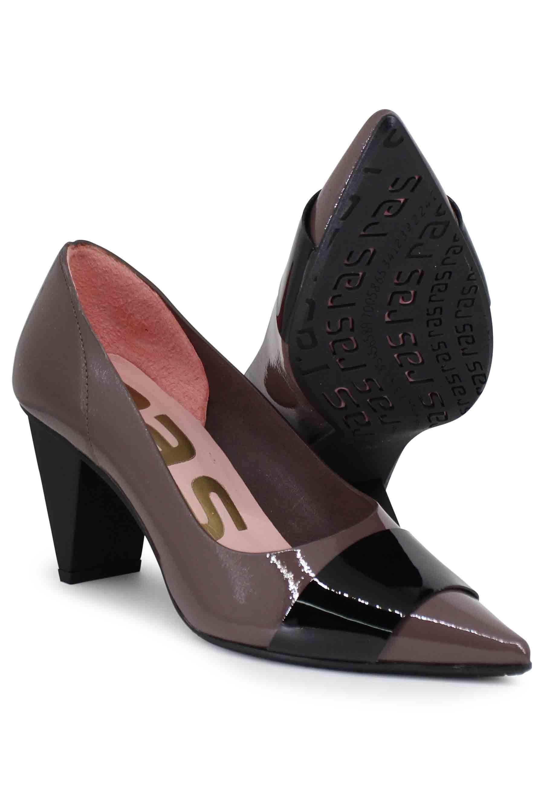 Ras women's pumps made of soft gray patent leather with black plexiglass insert. Pointed toe and matte heel. Soft rubber sole. Made in Spain. Composition and details: External material: fabric. Lining: leather. Sole material: rubber. Heel height: 7 cm. Fit: regular