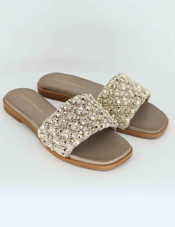 These women's flat sandals by Tsakiris Mallas combine bold design and practicality, ideal for those who love summer style with a bold touch. Crafted from woven fabric with leather details, they stand out for their decorative studs, adding personality and a rock-chic touch to the look. The semi-square toe follows current trends, while the soft, padded insole ensures a comfortable fit all day long. The non-slip rubber sole and 2 cm flat heel ensure comfort and stability, making these sandals perfect for both city wear and vacation. Perfect for casual chic looks, summer strolls, or travel, they pair easily with wide-leg pants, midi skirts, or light dresses, completing any outfit with character and style. Shop Tsakiris Mallas flat sandals now on Spatarella.eu and add a bold touch to your summer looks!